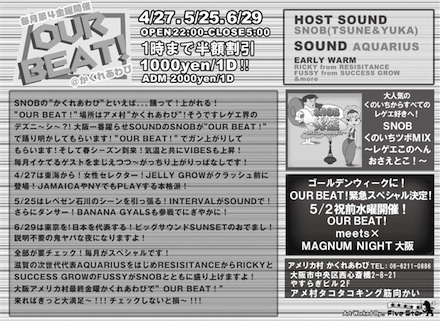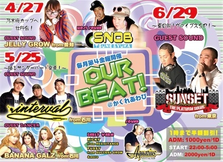 SNOBの”かくれあわび”といえば。。。 踊って!上がれる!”OUR BEAT!” 場所はアメ村”かくれあわび”! そうですレゲエ界のデズニ〜シ〜?! 大阪一番躍らせSOUNDのSNOBが ”OUR BEAT!”で踊り明かしてもらいます! ”OUR BEAT!”でガン上がりしてもらいます! そして春シ−ズン到来! 気温と共にVIBESも上昇! 毎月イケてるゲストをまじえつつ〜 がっちり上がりっぱなしです! 6/29は東京を!日本を代表する! ビッグサウンドSUNSETのおでまし! 説明不要の鬼ヤバな夜になりますよ! 全部が要チェック!