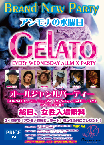 7月より「水曜アンモナ」が大変身 水曜大注目のNEW ALL MIX PARTY【Gelato】がいよいよSTART 7月「水曜アンモナ」に人気DJが集結音CDと映像映画同時にお届けする「最先端ALL MIX」が始動決定 そんなGELATOのスピンオフ企画が最終金曜の29日に登場(^ー^)ノその名も【GELATO+】 しかも新感覚ルールで楽しみましょう(^ー^)ノ 3つの楽しめるイベントがあります 1ブレスレットでスタイルアピール 入り口で好みのブレスレットをプレゼントします かわいい赤→現在彼氏or彼女がいて音楽&PARTYを純粋に楽しみに来た人 かわいい青