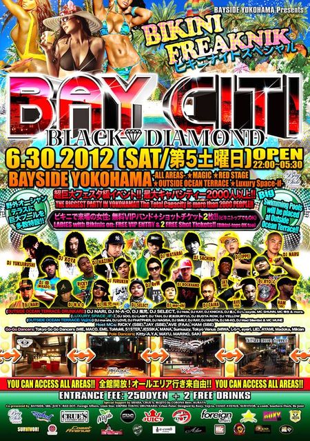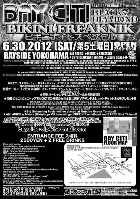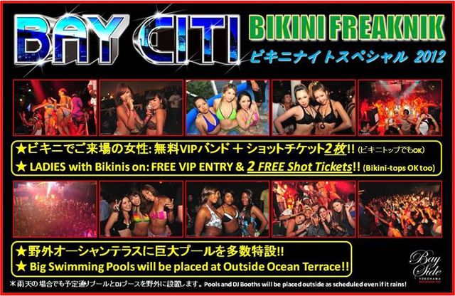 ベイサイド横浜 BAY CITI: ビキニナイトスペシャル2012 超巨大フェスタ級イベント: THE BIGGEST PARTY IN YOKOHAMA!! 超巨大フェスタ級パーティー! 最大キャパシティー2000人以上を誇る横浜最大級のベイサイド横浜にて6月30日(第5土曜日)横浜最大の動員数