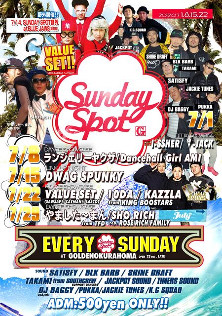SUNDAY SPOT 7月のスケジュール 1日『DEEYAY SHOWCASE』 ■I-SSHER ■∀-JACK 8日『DANCER SHOWCASE』 ■ランジェリーヤクザ ■Dancehall Girl AMI = = = = = = = = = = 14日『SUNDAY SPOT special』 〜夏だ!野外だ!ビーチでレゲエ!IN 淡路島〜 = = = = = = = = = = 15日『LINK UP NIGHT 』 ■DAWG SPUNKY 22日『DANCER SHOWCASE』 ■VALUE SET ■10DA ■KAZZLA from KING BOOSTARS 29日『DANCER SHOWCASE』 ■やました〜まん from TFD ■SHO RICH re