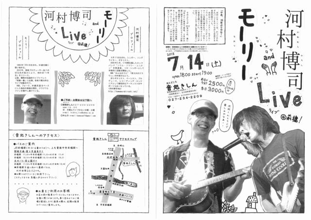 管理人様、告知をさせて下さい。 7月14日(土)、東京と奈良のそれぞれ個性的で魅力あふれる シンガーソングライターお二人に、きしんでライヴをやっていただきます。 東京からは、元ソウルフラワーユニオンのベーシスト&ギタリスト河村博司さん、 奈良からは、河村さんの古いお友達モーリーさん。 二人の熱くて優しい歌に包まれて、幸せな夏の一夜を過ごしてみませんか。 時間:18:00open 19:00start 料金:前売り・予約2,500円、当日3,000円(1drink付) ■ご予約・お問合せ■ ☆音処きしん:02