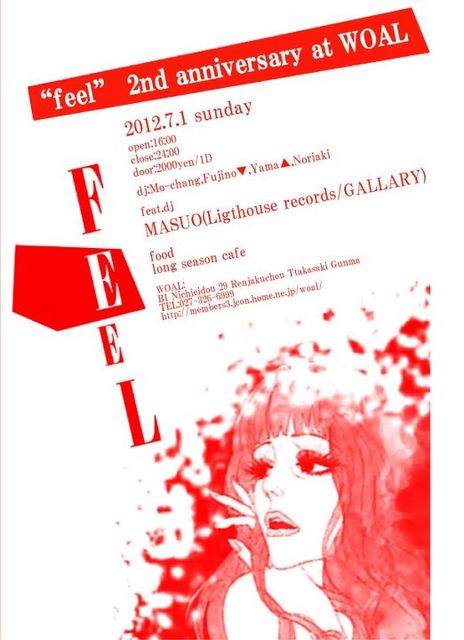 Lighthouse recordsのオーナーであり、SUNDAY AFTERNOON SESSION GalleryのLightingをつとめるMASUO氏が初登場! 2012.7.1(Sun.) feel 2nd Anniversary @高崎WOAL [DJs] MOROI (Sci-Fi@八王子SHeLTeR) FUJINO▼ YAMA▲ NORIAKI ASHIYA (StreetWize) [feat.DJ] MASUO (Lighthouse Records/Gallery) [FOOD] LONGSEASON cafe Open: 16:00-24:00 Admission: 2000yen(1 Drink) WOAL 〒370-0826 群馬県高崎市連雀町29 日英堂B1 TEL 027-326-6999(8pm〜) http://members3.jcom.home.ne.jp/woal/