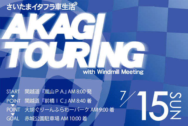 お久しぶりでございます(汗)どもども、、、 時は7月、、、 今年も群馬の「風車ミーティングさん」とご一緒に合同オフ会を開催します。 こちらでは、折角ですので関越は「嵐山PA」を集合とし(現地集合でも構いません)、「大胡道の駅」までをさいたまイタフラ〜でプチツーリングを行います。 ?「嵐山PA」集合。この時期、ここでは駐車場整理係員が配備されておりますのでここでは塊駐車はできないと思われます。 係員の指示のまま駐車、その後建物左側の屋外休憩場所で軽くドライバーズミーティングを行い、「嵐山PA」を出発。(予定