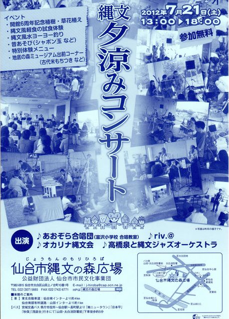 『縄文夕涼みコンサート』 2012年7月21日(土) 13:00〜18:00 出演時間 未定 仙台市縄文の森広場(公益財団法人 仙台市市民文化事業団) 982-0815 仙台市太白区山田上ノ台町10−1 アクセス http://www.city.sendai.jp/kyouiku/jyoumon/access/index.html ※無料イベントです。 出演:あおぞら合唱団・riv.@・オカリナ縄文会・高橋泉と縄文ジャズオーケストラ 縄文と触れ合いながら音楽を楽しみましょう♪
