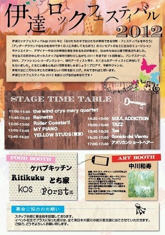 START 10:30 ※雨天中止 MY PIANO Reinette ROLLER CORSTER!! Sonido del Viento SOUL ADDICTION TAZZ Tae the wind crys maryquartet アメリカンショートヘアー Yellow Studs ☆13:40〜出演(予定) ★伊達ロックフェスティバル2012 http://www.daterock.jp/ ※最新情報&詳細はHPをチェックしてください。 http://yellowstuds.com/