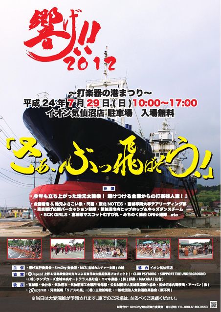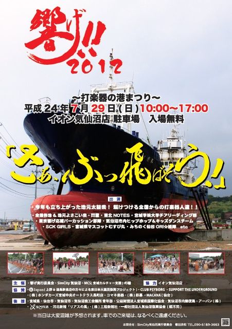 響げ!!2012 〜打楽器の港まつり〜 1、コンセプト 「さぁ、ぶっ飛ばそう!」 2、ねらい 市民の皆様に笑顔と元気を! ?次世代の子供たちが世界に誇れる街つくり ?ジャンルを問わずカルチャーによる都市と都市のつながり ?音楽による復興への街起こし 3、関係各社 主 催 : SimCity気仙沼 http://simcitykesennuma.sakura.ne.jp/index.html http://ameblo.jp/cimcitykesennuma http://mixi.jp/view_community.pl?id=5591636/ MCS(宮城カルチャー支援)の輪 http://mcssendai.grupo.jp/