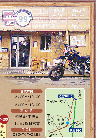 明日、松島あたりまで走って帰りにライダーズカフェに立ち寄ってみませんかぁ〜。 http://mixi.jp/view_community.pl?id=4231683&__from=mixi 店は12時からオープンです。 10時くらいに仙台市内のどこかで待ち合わせで