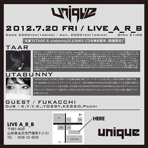 ※当日は?TAAR & utabunny?共作によるuniqueでのみ入手可能の最新MIX-CD(R)を先着順に数量限定