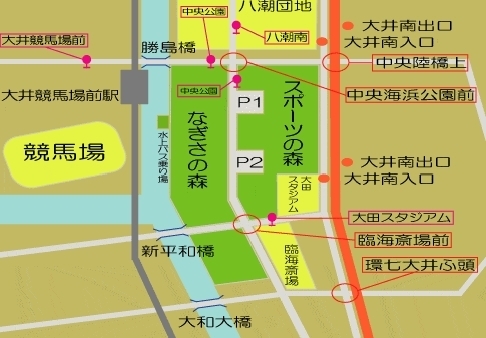 【日時】 7/1(日) 9:00〜11:00 【場所】 大井ふ頭中央海浜公園 (内スポーツの森・野球場) 品川区八潮4丁目1-19 http://www.ball-boy.net/tokyo23-1/0902.html http://www.mizuochi.net/bp/oifuto.shtml 【アクセス】 ・浜松町駅より 東京モノレール 「大井競馬場前」下車徒歩8分 ・品川駅(東口)より 都営バス「品91系統」 「八潮南」下車 徒歩6分 ・大井町駅(東口)より 都営バス「品91、井92系統」 「八潮南」下車 徒歩6分 京急バス「井12系統」「中央公園<大井ふ頭>」下車 徒歩5分 ・