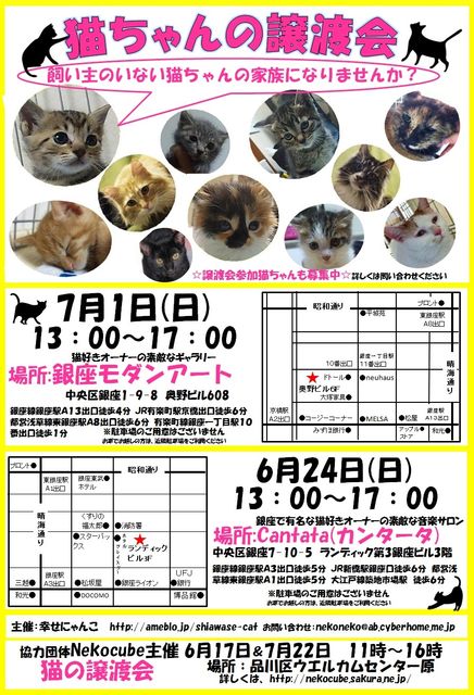 ★☆★☆★☆★猫ちゃんの譲渡会IN銀座★☆★☆★☆★☆ ☆★会場室内なので猫ちゃんを抱っこして触れ合ってください!!!★☆ 家族がいない猫ちゃんを家族の一員として迎えてくださいませんか? ・猫ちゃんをお迎えしたい方 ・すでにいる猫ちゃんのお友達になってくれる猫ちゃんをお探しの方 などなど ぜひ遊びにいらしてください。 ※譲渡にはお約束事がございます。詳しくは当日会場にてご説明いたします。 ※お迎えしたい猫ちゃんが決まった場合、後日ご自宅までお届けいたします。 当日お引き渡しすることはできませんの