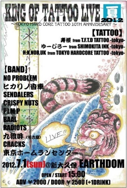 KING OF TATTOO 夏 2012 ~TOKYO HARD CORE TATTOO 10TH ANNIVERSARY~ 2012.7.1 [SUN] @ 新大久保 EARTHDOM OPEN/STRAT 15:00 ADV\2000/ DOOR\ 2500[+1 DRINK] [TATTOO] 寿桜 from T.F.T.D TATTOO -tokyo- ゆーじろー from SHIMOKITA INK -tokyo- H.K, NOB, UK from TOKYO HARDCORE TATTOO -tokyo- [BAND] NO PROBLEM ヒカリノ香車 SENDALERS CRISPY NUTS PIMP BAAL RADIOTS 九狼吽(名古屋) CRACKS 東京ホームランセンター
