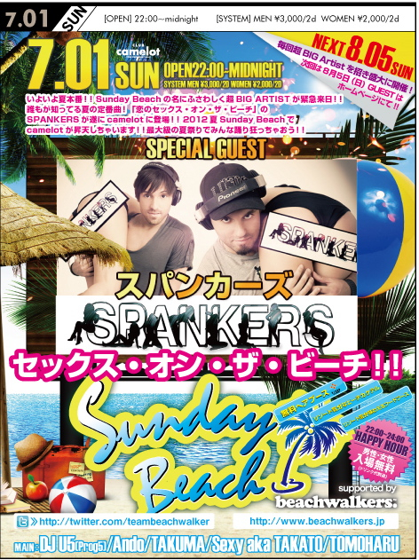 club camelotとbeachwalkers.がタッグを組み毎回超BIG Artistを招き盛大に開催している大人気イベント !!! 「Sunday Beach」!!! 今回なんと!7/1(日)は誰もが知っているパーティーチューン 「セックス・オン・ザ・ビーチ」 でおなじみの"あの" 【SPANKERS】 がCamelotに登場!!! SEX!SEX!!SEX ONTHE BEACH!!! みんなで叫びましょう! Camelotの熱い夏の、はじまり♪はじまり♪♪ 当日はスパンカーズより全員に素敵なプレゼントもあります!! 毎月第一日曜に開催中のCLUB CAMELOT一押しEVENT 「