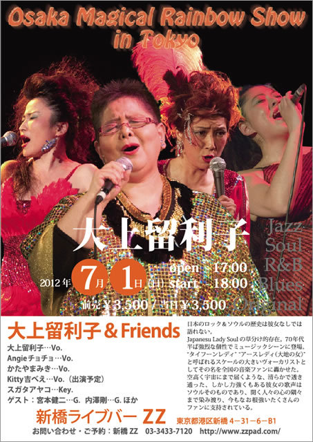「Osaka Magical Rainbow Show In Tokyo」 “タイフーンLady”大上留利子&Friends が、7月1日、東京に上陸 アメちゃんくれるおせっかいな大阪ミュージシャンとCOOLなイメージの東京ミュージシャン とのコラボレーション 場所は、ダディ竹千代さんがプロデュースする自由な空間「新橋ライブバーZZ」 面白そうな宝石箱、ふたを開けなきゃわかりませんが、ちょっと覗きに来てみてはいかがでしょうか 2012/7/1(日曜日) Open:17:00 Start:18:00 前売:3,500円 当日:3,500円 出演:大上留利子、