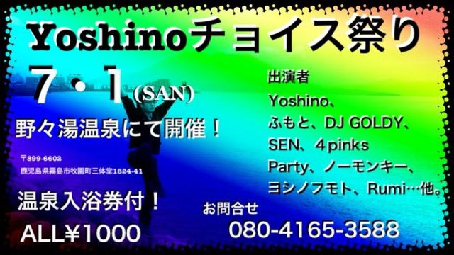 イベント名 【Yoshinoチョイス祭り】 開催日 7月1日(日曜) チケット ALL1000円 Open 11:00 LIVE START 12:00 LIVE END. 16:00 _____________________________ 開催場所… 野々湯温泉(金湯) 〒899-6602 鹿児島県霧島市牧園町三体堂1824-41 Tel 0995-76-9336 http://www.nonoyu.com/ 出演者 Yoshino(ミュージシャン)、 ふもと(お笑い芸人)、DJ GOLDY(DJ)、 SEN(ダンス)、4pinks(ダンス) Party(漫才)、ノーモンキー(漫才)、 ヨシノフモト(漫才)Rumi(ダンス)他…。 LIVEイベントPR 漫才、ダンス、ピンネタ、 D
