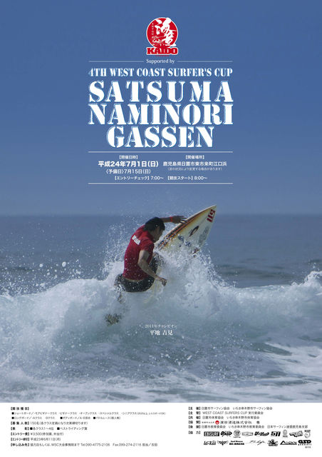 Shinpoさん、すんません。宣伝させてください。 今回はロングもありますよ〜。皆さん楽しみましょう♪ 4TH WEST COAST SURFERS CUP 【SATSUMA NAMINORI GASSEN】 【競 技 種 目】 ■ショートボード/・モアビギナークラス ・ビギナークラス ・オープンクラス ・スペシャルクラス ・シニアクラス(35才以上、レトロボードOK) ■ロングボード/・Aクラス ・Bクラス ■ボディボード/A・B混合 ■パドルレース(個人戦) 【募 集 人 数】 150名(各クラス定員になり次第締切ります) 【表 彰】 ■各クラス1〜4位 ■ベストライ