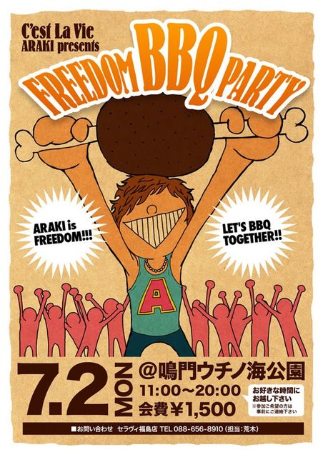 以下は、Pちゃんの日記より転載です。 皆様に報告です 先日UPさせてもらった荒木単独イベントの詳しい内容が決定しました パチパチパチパチ その名も 『FREEDOM BBQ PARTY』 とにかく最低限のマナーだけ守って頂き、その場を自由とします 開催日につきましては大変申し訳ございません。 私自身、仕事の都合上、7月2日の月曜日とさせて頂きます。 時間は11時〜20時まで炭火を絶やさずいこうと思っております FREEDOM(自由)なので、いつ来ていただいてもいつお帰りになっても構いません 開催場所はちょっと遠いのです