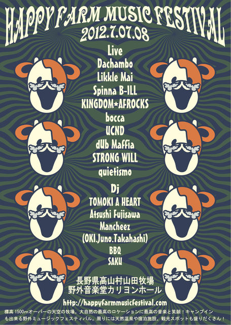 Happy Farm Music Festival 2012 2012年7月7日、8日(土、日) @長野県高山村山田牧場野外音楽堂カリヨンホール 長野県高山村山田牧場にて行われる、 キャンプインも可能な野外ミュージックフェスティバル 標高1500mオーバーの天空の牧場。 大自然の最高のロケーションと、最高の音楽! 周りには天然温泉や宿泊施設、観光スポットも盛りだくさん! 出演アーティスト Dachambo Likkle Mai Spinna B-ILL KINGDOM☆AFROCKS bocca UCND dUb Maffia STRONG WILL quietismo DJ's TOMOKI A HEART
