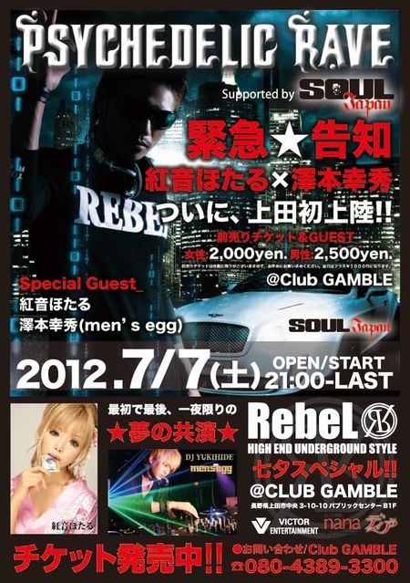 PSYCHEDELIC RAVE ★七夕スペシャル★ 〜IN UEDA〜 SUPPORTED by SOUL JAPAN 紅音ほたる×澤本幸秀 ついに上田初上陸!! 最初で最後、一夜限りの 夢の共演!! Special Guest_ 紅音ほたる 澤本幸秀(men's egg) 2012.7月7日(土) 21:00〜LAST @CLUB GAMBLE 前売り&GUEST_ 女性:¥2,000yen 男性:¥2,500yen お問い合わせ先_ 080-4389-3300/CLUB GAMBLE @Club GAMBLE 長野県上田市中央3-10-10 パブリックセンターB1F