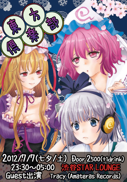 ──────第五回 東方倶楽部!!────── ■日時 7/7 (土) 23:30-05:00 コスプレする方は15分前(23:15)より入場可 ■場所 渋谷STAR LOUNGE 東京都渋谷区宇田川町4-7トウセン宇田川ビル1F (東急ハンズ正面口の真向かいのビルの1F) TEL: 03-6277-5373 03-6277-5373 http://www.starlounge.jp/ ■入場 \2500-(1Drink付) mixi、Tweetvite表明フライヤー提示で \500 OFF!! ※割引の併用不可 再入場可能 ※コスプレの方は上着等を羽織るなどご配慮お願いします 東