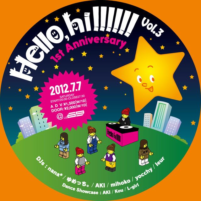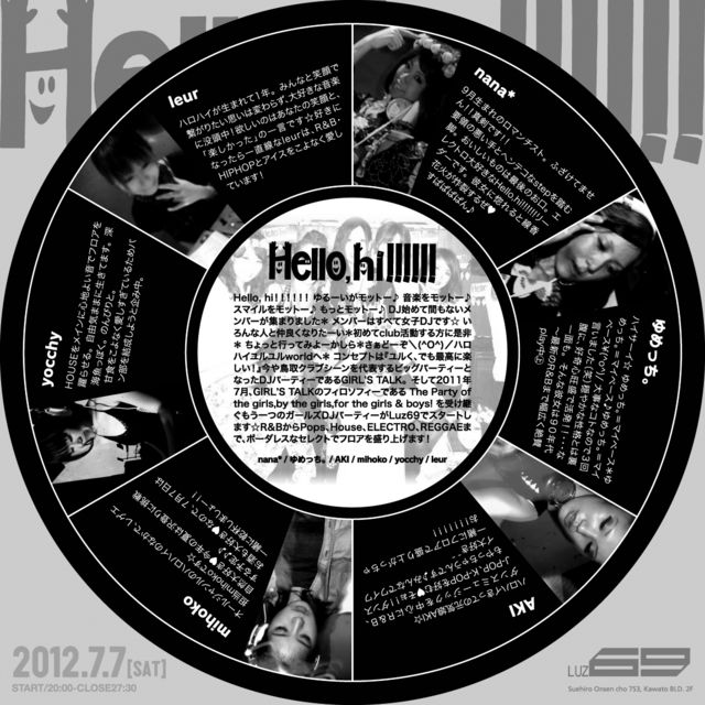 【Hello, hi!!!!!! Vol.3】 ☆all genre party☆ 2012年7月7日(土) Open 20:00〜 close 27:30 Place LUZ69(鳥取市末広温泉町753-7川戸ビル2F) 前売り 1500yen(1D) 当日 2000yen (1D) ご来場頂いた方全員にプチプレゼント◎ 先着でコンピCDもプレゼント◎ ticket info…LUZ69.LUZ CAFE.world R&B,REGGAE,ELECTRO,HOUSE,JKーPOP,and more!!! DJs : nana* / AKI / よっちぃ / mihoko / ゆめっち。/ leur 今回もダンスショーケース