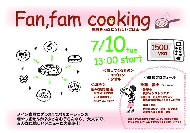栄養士さんによる料理教室。 同じ食材で、子供向けとお父さん向け両方つくっちゃえるそうな。。。 毎日の献立に悩むママさん、要チェック。 エプロンとタオル持ってきてねん。 参加費1500円 お申し込みは、府中ノアンテナまで 電話 0847-44−6227 メール info@fuchu-antenna.jp