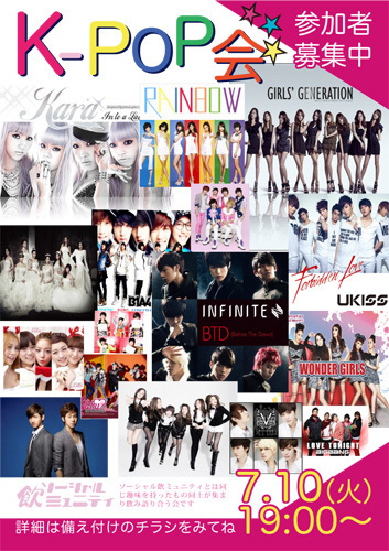 イベント告知失礼致します。 7/10(火)仙台国分町周辺で行います☆ KARA、少女時代、東方神起、BIGBANG、 RAINBOW、T-ARAなどなど とにかくK-POPは好きという方! ・ハイクオリティなダンスが好き ・美脚を目指している ・K-POPアイドルと同じコスメを使っている ・韓国語バージョンで歌える ・K-POP友だちが周りにいない ・AKBよりもK-POP ・K-POPメイクを真似している 他にもK-POP好きに当てはまる人はぜひご参加ください! K-POPをお題にみんなで語って輪を広げていこう! 会社帰りに…学校帰りに… オフ会