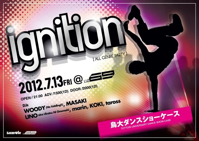今月もDJしちゃうよー!鳥大ダンス部によるダンスショーケースもあるし、たろすもおるし、よかったらぜひ起こしください♡(#^.^#) 「ignition vol.3」 [ALL GENRE] ■2012.07.13(Fri) ... ■OPEN / 21:00 ■@LUZ69 ■ADV /1500(1D) ■DOOR /2000(1D) ■DJs WOODY(No kidding!!) MASAKI UNO aka Ukatsu Ni Omorashi marin KOKI taross(New Crew!!) ■showcase 鳥大ダンス部によるダンスショーケース☆☆☆ ■CONCEPT どこにでもいる平凡な学生が非日常的なクラブという空間でDJを通じて行う自己