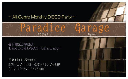 ----Paradise Garage(パラダイス ガレージ)---- 〜All Genre Monthly DISCO Party〜 ♪Vol.6♪ 毎月第2土曜日マンスリーDISCO Party第6弾! あの懐かしい70's・80's Soundを中心に 新旧オールジャンル ダンスミュージックで 楽しめる大人の踊り場です♪ スペシャル企画の告知があるかも・・・?! ☆DJ Line Up☆ 渋いSoul,R&B,DanceClassicsならお任せ!Stepperの強い味方♪【DJ.Y's】 元マハラジャDJ!メローなR&BからガチアゲEUROBEATまで完全網羅!【DJ.K-1】 70's Soulから最新CLUB HIT'sまでチョイスで