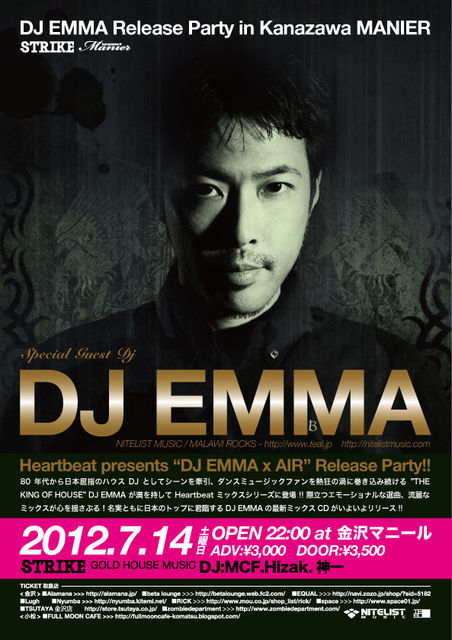 管理人様、告知失礼致します。 不適切であれば、お手数ですが削除願います。 この夏はDJ EMMAで ■2011.7/14日(SAT) 22:00 start MIX CD Release Party "hearbeat presents DJ EMMA×AIR " + STRIKE DJ EMMA ■TICKET/ ADV: 3000YEN-NO DRINK. DOOR: 3500YEN-NO DRINK ■GUEST DJEMMA(NITELISTMUSIC TEAL) ■DJ 神一 MCF HIZAK (STRIKE) ☆DJ EMMA@金沢マニールに 少しでも興味をもたれた方はmixiにてメッセージください。 (前売り、団体割引等、何でもご相談ください。) MCF ■Manier http://m