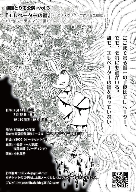 突然の告知、失礼します。SENDAI KOFFEEで行われる演劇公演のお知らせです。 劇団とりるvol.3 『エレベーターの鍵』(アゴタ・クリストフ作、堀茂樹訳) (+他リーディング一編) 日時: 7月14日(土)/ 7月15日(日) 19時半開演(19時開場) 場所: SENDAI KOFFEE 料金: 2000円(ケーキセット付) 出演: 中島碧(一人芝居)、後藤史織(リーディング) 演出: 小林亜希 『悪童日記』で有名なアゴタ・クリストフの戯曲を一人芝居で上演します。もう一編のリーディングは、当日のお楽しみに。 お問い合わせ: trill.cafe@gmail.com
