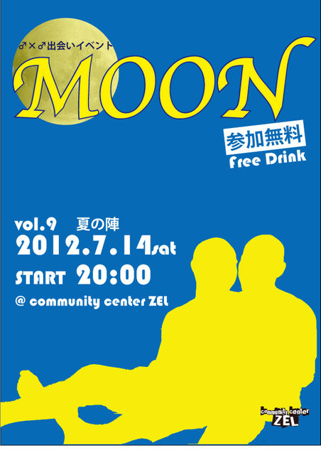 ♂×♂出会いイベント「MOON」 Vol.9 夏の陣 2012.7.14[sat]20:00start @community center ZEL 参加無料・Free Drink* ソフトドリンクのみ。アルコールはありません。 参加には申込が必要です(当日申込可)。 ★申込フォーム★ http://form1.fc2.com/form/?id=559249 ↑注意↑質問など返信が必要な場合は、備考欄へメールアドレスを記入してください。 「♂×♂の出会いの場があったらいいなぁ」 ZELに来場したお客さんの そんな一言を実現するために立ちあがった ♂×♂出会いイベント「MOON」。 毎回10名前後の参加でアット