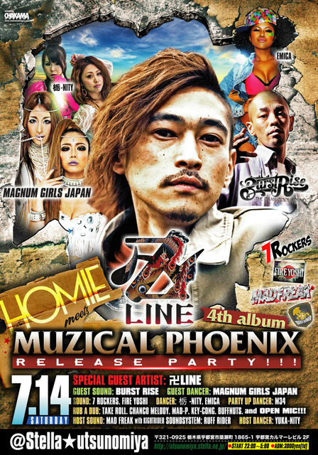 HOMIE 卍LINE 4th album MUZICAL PHOENIX RELEASE PARTY!! ■SPECIAL GUEST ARTIST≫ 卍LINE ■GUEST SOUND≫ BURST RISE ■GUEST DANCER≫ MAGNUM GIRLS JAPAN ■SOUND≫ 7 ROCKERS / FIRE YOSHI ■DANCER≫ 栃-NITY / EMICA ■PARTY UP DANCER≫ M34 ■RUB A DUB≫ TAKE ROLL / CHANCO MELODY / MAD-P / KEY-CONG / BUFFNUTS / and OPEN MIC! ■HOST SOUND≫ MAD FREAK wiz KNIGHT RIDER sound system / RUFF RIDER ■HOST DANCER≫ YUKA-NITY OPEN 11pm ADM.\3000-1d 宇都宮STELLA 宇都宮市簗瀬町1865-1