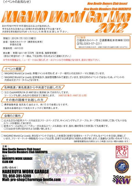 ○NAGANO World Car Liveは、駐車場及び、施設管理費のみで運営しています。営利目的のイベントではないため、イベントの内容は完全フリータイムとなります。