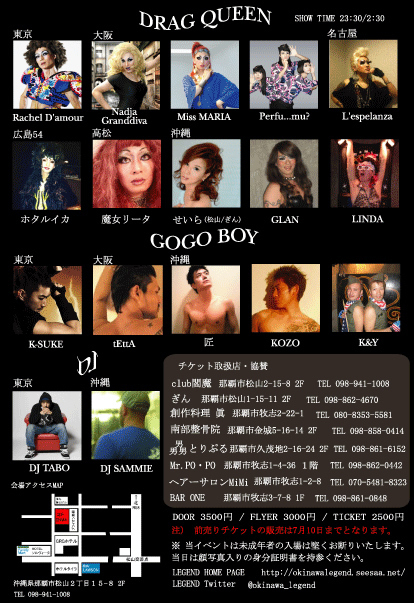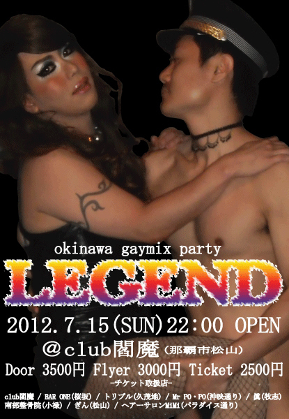 *** GAY MIX *** º£²ó¤ÎLEGEND¤ÏÆáÇÆ¾¾»³¤Î clubïåËâ¤Ç³«ºÅ¡¡£³Ï¢µÙ¤ÎÃæÆü ²ÆÅþÍè¤À¤·¡¢²È¤Ç¤¸¤Ã¤È¤·¤Æ¤ë¤Î¤â ¤â¤Ã¤¿¤¤¤Ê¤¤¤¸¤ã¤Ê¡¼¤¤¡© º£²ó¤âÅìµþ¡¢Ì¾¸Å²°¡¢Âçºå¡¢¹Åç ¤â¤Á¤í¤óÃϸµ²Æì¤«¤é¤â¹ë²Ú¥²¥¹¥È¤¬Â罸·ë ¶½Ê³¤Î°ìÌë¤ò¸«Æ¨¤¹¤Ê OPEN¡¡22:00¡Á ²ñ¾ì¡¡Club Enma(ïåËâ) DOOR¡¡\3500±ß FLYER¡¡\3000±ß TICKET¡¡\2500±ß SHOW TIME¡¡23:30 / 02:30¡¡ ¢£DJ DJ TABO (TOKYO) DJ SAMMIE ¢£GOGO BOY K-SUKE (TOKYO) tEttA (OSAKA) ¾¢ KOZO K&Y ¢£DRAGQUEEN Rachel D'Amou