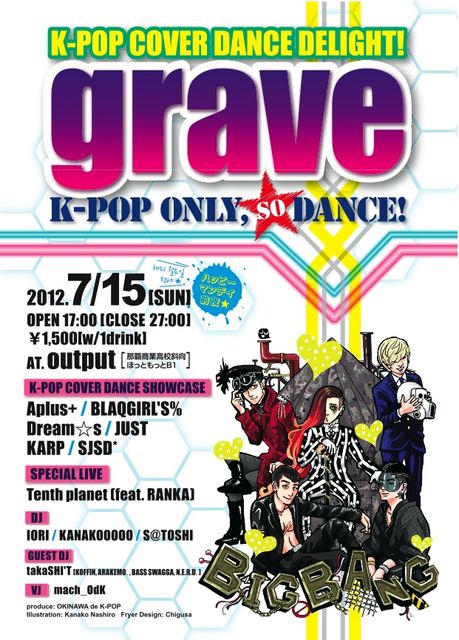 K-POP ONLY, SO DANCE! K-POP COVER DANCE DELIGHT! grave 2012.7/15[SUN] ¡ù¥Ï¥Ã¥Ô¡¼¥Þ¥ó¥Ç¥¤Á°Ìë OPEN 17:00 [CLOSE 27:00] ¡ï1,500[w/1drink] AT. output ¡ÊÆáÇÆ¾¦¹â¼Ð¸þ¤Û¤Ã¤È¤â¤Ã¤ÈB1¡Ë K-POP COVER DANCE SHOWCASE Aplus+ BLAQGIRL'S% KARP SJSD* SPECIAL LIVE Tenth planet (feat. RANKA) DJ IORI KANAKOOOOO S@TOSHI GUEST DJ takaSHI'T [KOFFIN, ARAKEMO¡£, BASS SWAGGA, N.E.R.D¡£] VJ mach_OdK produce: OKINAWA de K-POP Illustration: Kanako Nashiro Fryer Design: Chigusa ¡úgrave¤ÏK-P