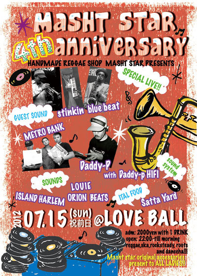 ÆáÇÆ»ÔÉâÅçÄ̤ê¤Ë¤¢¤ë¥Ï¥ó¥É¥á¥¤¥É¡õ¥»¥ì¥¯¥È¥ì¥²¥¨¥·¥ç¥Ã¥×¡¡Masht star¤Î£´¼þǯ¥¢¥Ë¥Ð¡¼¥µ¥ê¡¼¥Ñ¡¼¥Æ¥£¤Ç¤¹¡£ ÆáÇÆ¤Ç¤Ï½é¥é¥¤¥Ö¤È¤Ê¤ë¥á¥ó¥Ð¡¼¤Ç¤ÎSTINKING BLUE BEAT¤ò¤Ï¤¸¤á¡¢DADDY-P¡¢METRO BANK¤ò¥²¥¹¥È¤Ë·Þ¤¨³Ú¤·¤¤°ìÈÕ¤ò¤ªÆÏ¤±¤·¤Þ¤¹¡ª ¹¹¤ËÍè¾ì¤Î½÷À¤Ë¤ÏÁ´°÷¤Ë¥ª¥ê¥¸¥Ê¥ë¤Î¥Ï¥ó¥É¥á¥¤¥É¥¢¥¯¥»¤ò¥×¥ì¥¼¥ó¥È¡ª Masht star 4th anniversary 2012.07.15(sun)½ËÁ°Æü ¡÷LOVE BALL °ì¶äÄ̤ê¥è¡¼¥í¥Ô¥¢¥ó¥Ó¥ë4F 2000yen with 1 drink 22:00¡Átill morning ¡ÚSPECIAL LIVE¡Û STINKING BLUE BEAT ¡ÚGUEST SOUND¡Û Daddy-P from