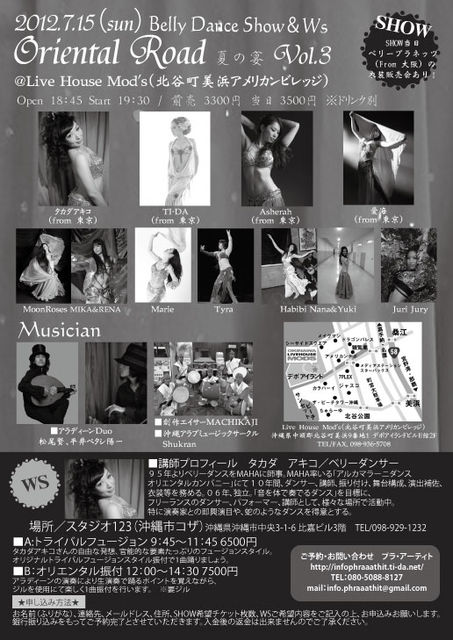 2012.7.15(Æü) Belly¡¡Dance¡¡Live¡¡Show¡õWs ¡ÖOriental Road ²Æ¤Î±ã Vol.3¡×in²Æì¡¡ ²Æì¤Ç¤Ï¤Ê¤«¤Ê¤«¤ªÌܤˤ«¤«¤ë»ö¤¬½ÐÍè¤Ê¤¤¡¢¥Ù¥ê¡¼¥À¥ó¥¹Live¡¡Show¡ª¡ª ÆüËܥȥåץ¢¥é¥Ö¥ß¥å¡¼¥¸¥·¥ã¥ó Alladeen ¤È²Æì½é¡ª¥¢¥é¥Ö¥ß¥å¡¼¥¸¥Ã¥¯¥µ¡¼¥¯¥ë¡¡Shukran¤Î¥³¥é¥Ü¤¢¤ê¡ª¡ª ---¢ãShow¢ä--- Æü»þ¡§2012.7.15¡ÊSUN¡Ë »þ´Ö¡§Open¡¡18¡§45¡¡Start¡¡19¡§30 ÎÁ¶â¡§Á°Çä3300±ß¡¡ÅöÆü3500±ß¡¡¢¨¥É¥ê¥ó¥¯ÊÌ ¾ì½ê¡§Live¡¡House¡¡Mod's¡¡ ¢©904-0115 ²Æì¸©ÃæÆ¬·´ËÌëĮÈþÉÍ9ÈÖÃÏ1 ¥Ç¥Ý¥¢¥¤¥é¥ó¥É¥Ó¥ëE´Û2F http://livehou