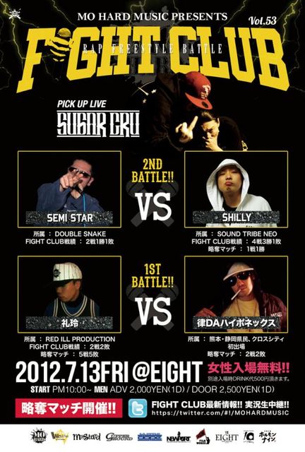 まずは今週金曜日に開催しますのは、EIGHTの第2金曜日レギュラーイベント === MO HARD MUSIC PRESENTS "FIGHT CLUB" Vol.53 === RAP FREESTYLE BATTLE!! START PM10:00~ MEN : ADV 2,000yen(1D) / DOOR 2,500yen(1D) LADIES CHARGE FREE!! 但し入場の際ドリンク代500円頂きます。 ↓↓↓PICK UP LIVE↓↓↓ SUGAR CRU (MO HARD MUSIC) ↓↓↓FREE STYLE BATTLE↓↓↓ 1st BATTLE : 礼玲 (RED ILL PRODUCTION) VS 律DAハイポネックス (熊本・静岡県民、クロスシティ) 2nd BATTLE : SEMI STAR (DOUBLE SNAKE)