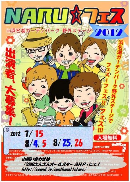 今週末開催です完全自主企画イベント 『NARU☆フェス2012』 全てが自主制作な手作りイベントです「音楽の楽しさをたくさんの人と共有したい」という思いから始まったイベントです☆(>ω・)!!! お陰様にてたくさんのアマチュアミュージシャン達にご出演をいただき、また、色々な方の力を借りながら、今年も盛大に開催できそうです 2012年7月15日(日) @浜名湖ガーデンパーク屋外ステージ 【出演者】 ☆13:00〜13:30 サージェント ☆13:40〜14:10 ソルキャラ ☆14:20〜14:50 HoneyTrap ☆15:00〜15:30 もやし ☆