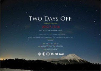 「TwoDaysOff」5周年、13回目 1年の充電期間を経て、再始動です!!!!!!! 開催概要、及び出演者の発表を行います! (開催日) 7月15日15時30分スタート(翌日は海の日にて祝日ですよ) (イベント会場) 静岡県富士宮市根原228 ハートランド朝霧内レストラン跡地 (チケット代&宿泊費) ENTRANCE ¥2,500 宿泊費 テント一梁 ¥3,000 ロッジ泊 ¥2,500 ☆ テント泊を一梁三名で参加いただいた場合、お一人合計¥3,500