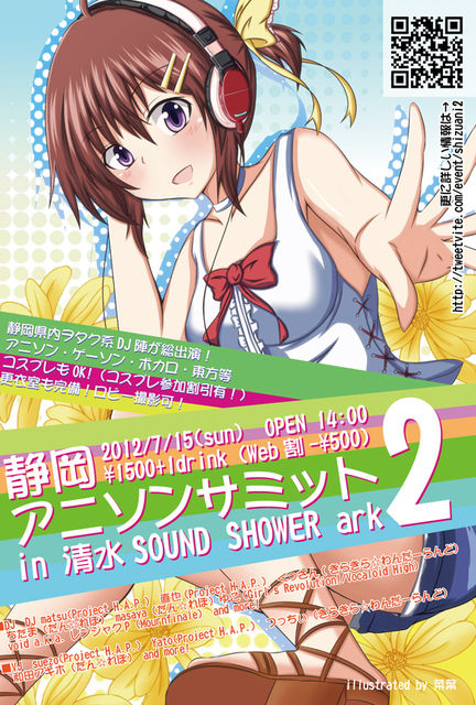 これが静岡県の最先端!! 静岡県内ヲタク系DJ陣が総出演のアニソンパーティ! アニソンを初めゲーソン、ボカロ、東方等、 様々なヲタ系ミュージックを爆音で楽しめます!! 会場は綺麗でクラブ・ライブ初心者にもおすすめです!!! 会場の清水arkは県内最大級のライブハウス! なんとキャパは600人!!! もちろんコスプレもOK!更衣室も完備です! 綺麗なロビーで撮影もOK!!! 是非お友達お誘い合わせの上お越しください!!! 静岡アニソンサミット @清水SOUND SHOWER ark 【日時】 2012/7/15(Sun) @清水SOU