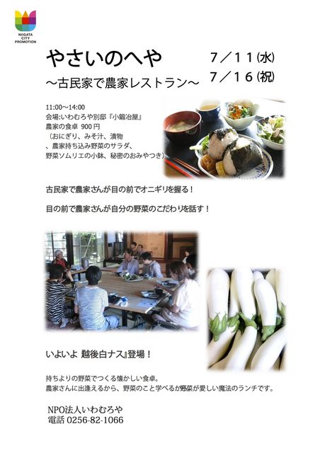 『古民家で農家ランチ』 古民家で農家さんが目の前でオニギリを握る! 目の前で農家さんが自分の野菜のこだわりを話す! だから美味しい農家交流型食堂。 時間:11:00~14:00 会場:いわむろや別邸『小鍛冶屋』 メニュー:農家の食卓 900 円 おにぎり、みそ汁、漬物、デザート 農家持ち込み野菜のサラダ 野菜ソムリエの小鉢 秘密のおみやつき
