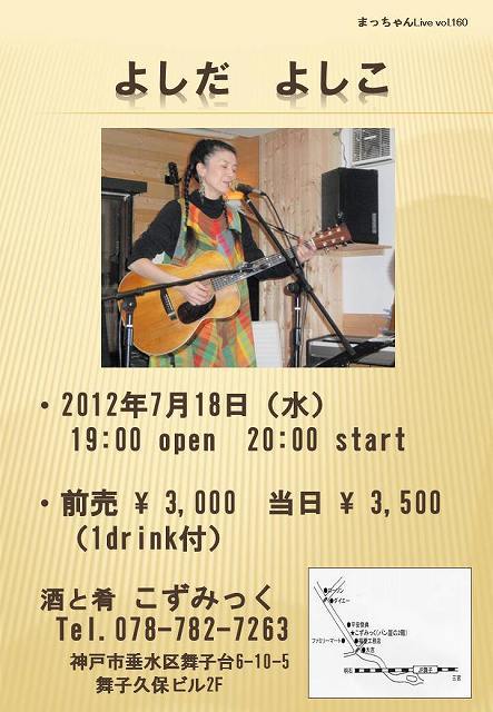 ☆まっちゃんLive vol.160☆ よしだ よしこ 日時:2012年7月18日(水) 19:00 open 20:00 start 料金:前売 \ 3,000 当日 \ 3,500 (1 drink 付) 会場:酒と肴 こずみっく(神戸・舞子) Tel.078-782-7263 神戸市垂水区舞子台6-10-5 舞子久保ビル2F