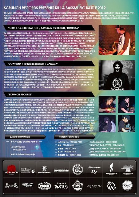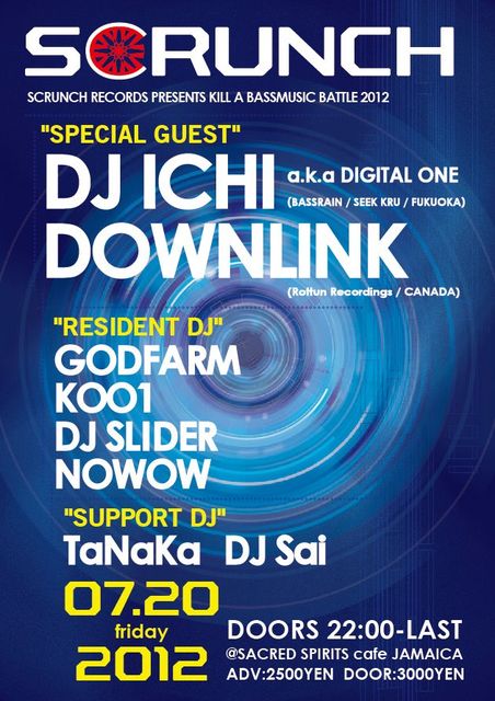 2012.07.20(FRI)@SACRED SPIRITS cafe JAMAICA Start 22:00~LAST ADV:2,500±ß¡¡DOOR:3,000±ß "SCRUNCH" -KILL A BASS MUSIC BATTLE 2012- "SPECIAL GUEST" DJ ICHI a.k.a DIGITAL ONE (BASSRAIN / SEEK KRU / FUKUOKA) DOWNLINK (ROTTUN RECORDINGS / CANADA) "RESIDENT DJ" GODFARM KOO1 DJ SLIDER NOWOW "SUPPORT DJ" TaNaKa (SACRED SPIRITS CAFE JAMAICA / HIROSHIMA) DJ Sai (HIROSHIMA) 2012ǯ6·î15Æü(fri)¤ËSACRED SPIRITS CAFE JAMAICA¤Ç¹Ô¤ï¤ì¤¿ "SCRUNCH RECORDS KICKOFF PARTY"¤¬Í½ÁÛ¤òÍÚ¤«¤Ë¾å²ó¤ëÂçÀ¹¶·