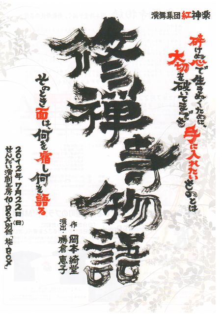 長いご無沙汰をお許し下さい いろいろありましたが やっと、震災後、初となる 公演のお知らせをさせて頂くことが出来ました。 公演としてはなななんと2年ぶりー 岡本綺堂:作 「修禅寺物語」 新歌舞伎の名作と言われてます。 来月、7月22日(日) 卸町の能−BOX(せんだい演劇工房10−BOX別館)で上演します。 開演は12:30と15:00の2回です。 今回、チラシ表面の題字と詩(うた)を作ってくださったのは、 南三陸町でTシャツやトートバッグなどのデザインを手がける 「M&B