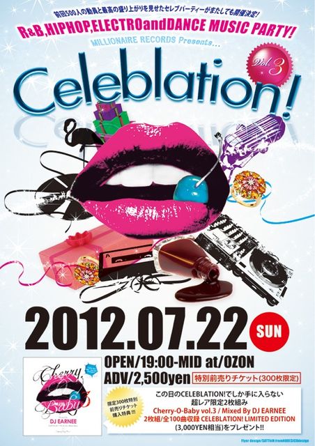 CELEBLATION! 2012.07.22(SUN) OPEN/19:00-MID @OZON ADV/2,500YEN特別前売りチケット(300枚限定) この夏、毎回500人以上の動員を誇る最大のエンターテイメント 『CELEBLATION!』第3弾が開催決定!! 名古屋を代表するセレクトSHOP「SAKURA」「JAMES」&名古屋のカリスマダンサーAYAが出掛けるブランド「JELLY DOLL」のFASHION SHOW。 DJ EARNEEを筆頭に間違いないDJ陣。 SEXY&CUTEなFLOOR GIRLSとCELEB MODELSも多数参加。 更には楽しめる事100%間違い無しのDRAG QUEENのSHOWCASE。 名古屋最高峰のエンターテイメントをお届けします!