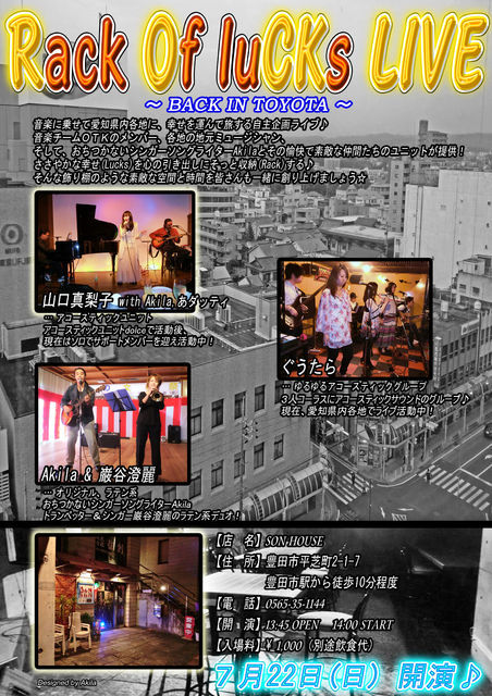 貴重なスペースをお借りして告知させていただきます☆ この度ようやく、 豊田市内で自主企画ライブを主催させていただく事に成功しました♪ 豊田市のSON HOUSE(サンハウス)というライブバーで行なわれます♪ これを機に豊田市も音楽で盛り上げていきたいと思いますので、 ぜひ遊びにいらしてください♪ 音楽に乗せて愛知県内各地に、 幸せを運んで旅する自主企画ライブ♪ 音楽チームOTKのメンバー、各地の地元ミュージシャン、 そして、おちつかないシンガーソングライターAkila とその愉快で素敵な仲間たちのユニットが提供します。