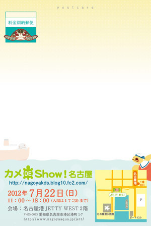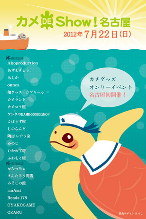 日程:2012年7月22日(日曜日) 時間:午前11時から午後6時まで(入場は5時半までです) 場所:名古屋港 JETTY WEST2階 http://www.nagoyaaqua.jp/jett/index.html 直接出店:あしか、あずまきょう、亀グッズ・ジブリール、カメランド、カメロク屋、ケンタのKAME−GOODS SHOP、こぼうず屋、しのらんど、陶房 レアラ窯、ふわもこ屋、むかめ工房、みのじ、Akoproduction、onnea 直接出店:かたっちょ、きんたろう商店、maAmi、Beads 178、みそじの館、OYAKOGAME、OZARU 公式サ
