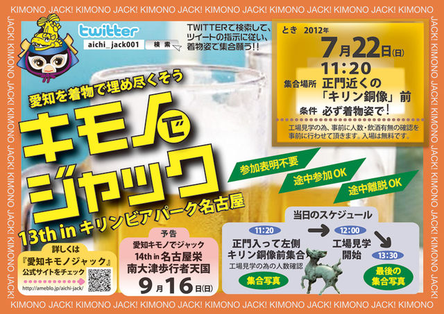 ☆★☆★☆★ キモノでジャックin愛知 13th ☆★☆★☆★ 東山動植物園ジャックはお陰様で大盛況でした〜。 しかも100名程お集まり頂いて驚き!。 名古屋城に続いて歴史に残るジャックでした!。 な、なんと東山動植物園のブログに載せて頂いちゃった。。 http://www.higashiyama.city.nagoya.jp/17_blog/index.php?date=2012-05-29 さて、次回ジャックは7月22日キリンビアパーク名古屋で開催します。 ジャック初の工場見学。 その後はお楽しみのビールが!!。 梅雨が明けていると良いですね!。 http://amebl