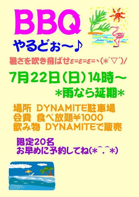 1日が雨で延期になったBBQ 22日(日)に決定!! 予約受付してまぁ〜す